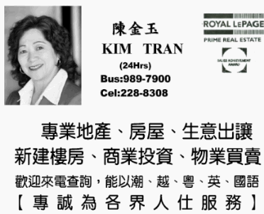 陈金玉 ROYAL LEPAGE KIM TRAN 989-7900 CELL 228-8308
